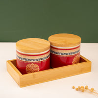 Featuring 2 ceramic jars with lids in a bold red–black palette, paired with a finely crafted pinewood, to elevate your Diwali get-together and celebrations .