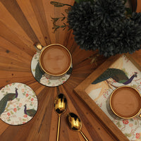 Enchant your sips with Mor Round Coasters. Peacocks and flowers elevate your moments. Elevate your beverage experience—add Indian-inspired elegance to every sip.